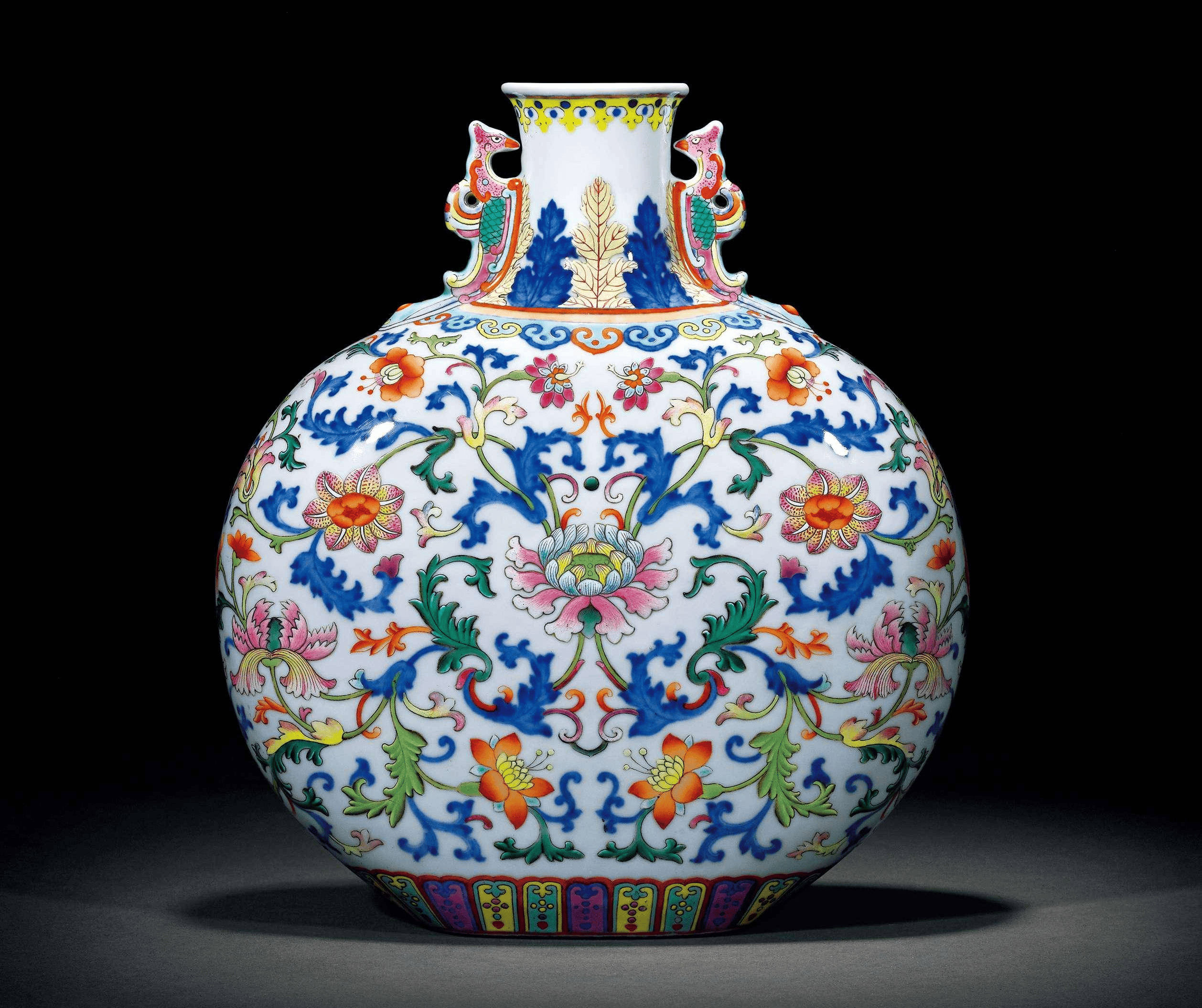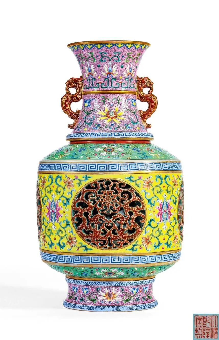 洋彩瓷器国内价格:如图,2019年北京保利拍卖会上一件清乾隆 御制洋彩双龙耳转心瓶成交价格,以9200万高价成交,再一次印证了洋彩釉瓷器的珍罕;