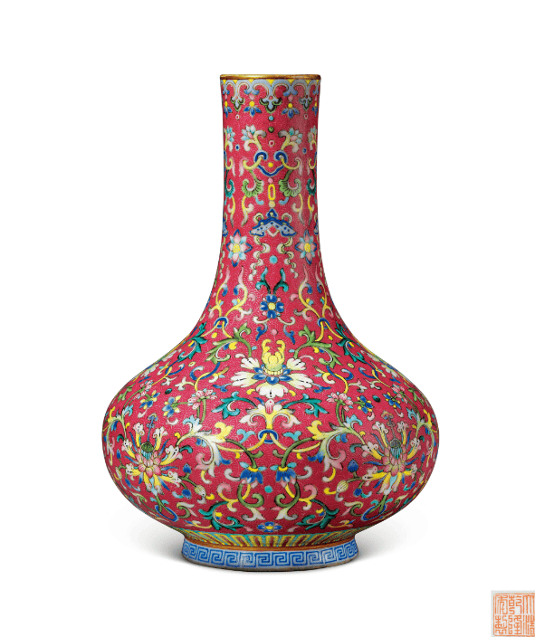 清乾隆胭脂红地洋彩轧道缠枝花卉纹长颈瓶成交价格927.6万港元