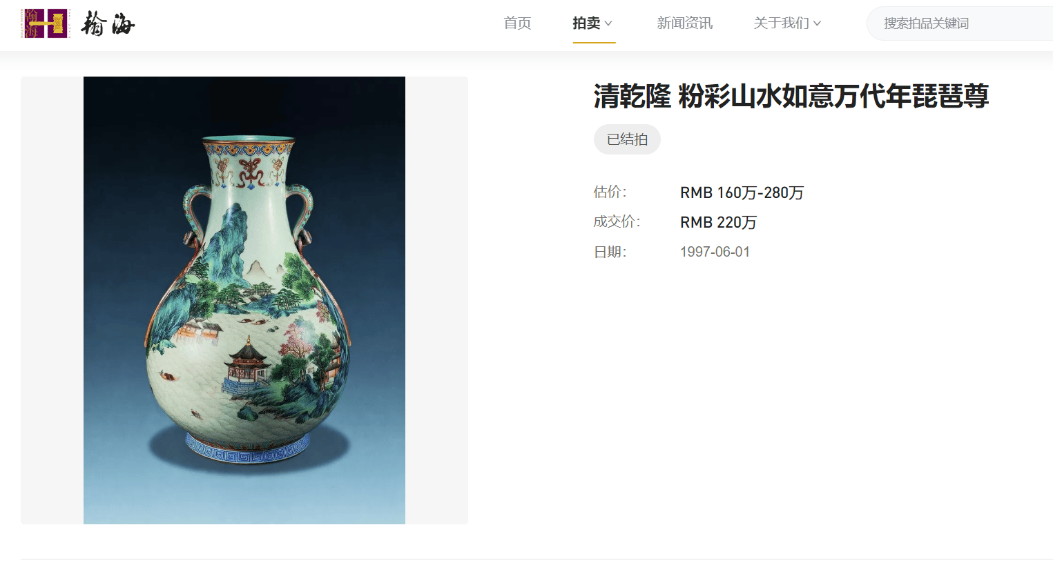 乾隆粉彩瓷器拍卖记录:此件 “清乾隆 粉彩山水楼阁如意万代耳琵琶尊”首次公开拍卖是1997年6月1日在北京瀚海以220万元成交; 其次是2011年12月6日在北京保利的秋拍场上以4000万元起拍,经过激烈竞逐,最终以5462.5万元成交;然后是2018年12月8日再次在北京保利秋季拍卖会上以9487.5万元高价成交。21年时间里,此件清乾隆 粉彩山水楼阁如意万代耳琵琶尊价格从220万元涨到了9487.5万元,升值了43倍,年复合增长率达19.7%,堪称股神级的投资回报率。
