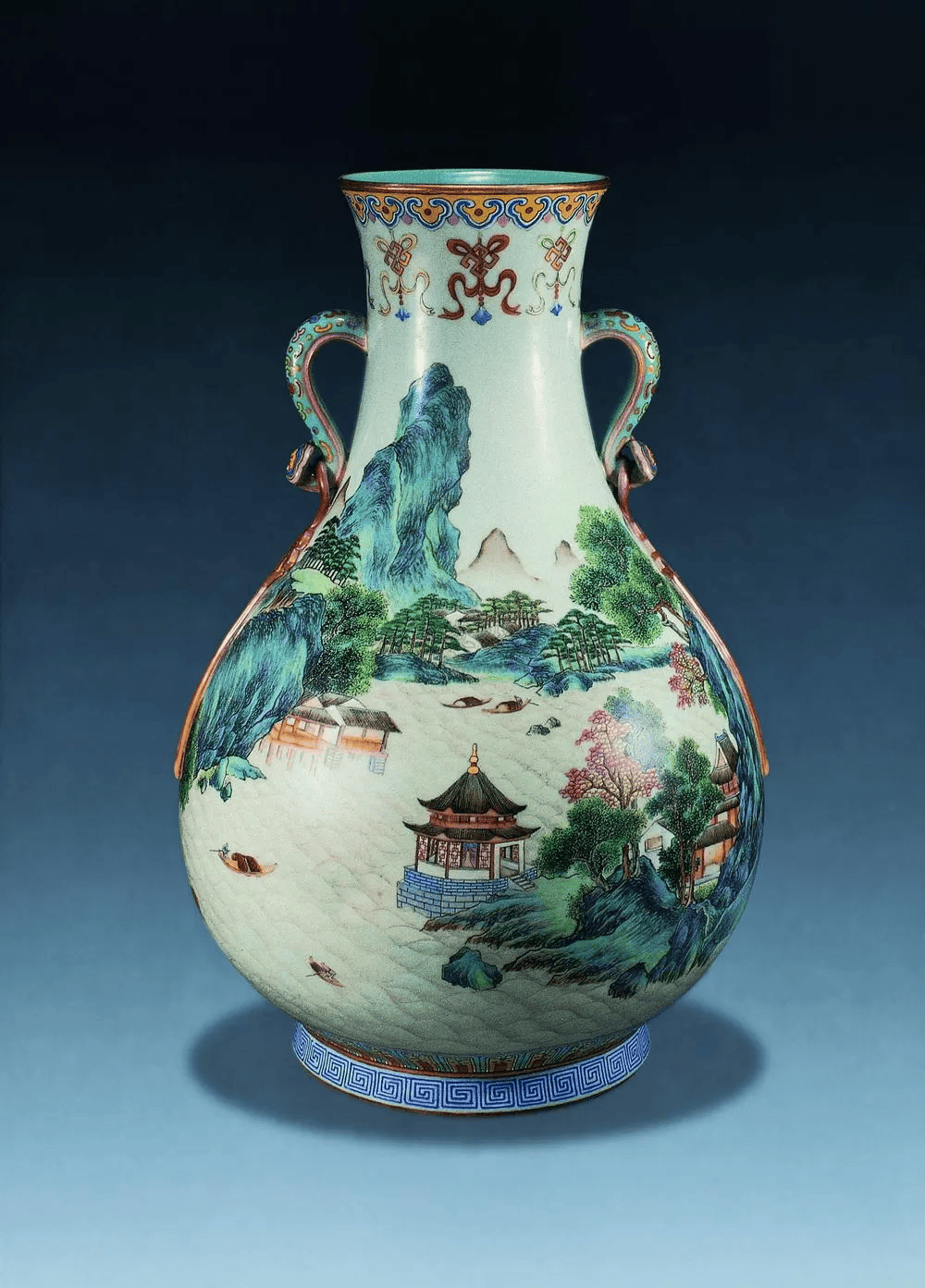 我们今天要介绍的乾隆粉彩,名为:“清乾隆 粉彩山水楼阁如意万代耳琵琶尊”,这是一件无论在造型、纹饰、款识,亦或在传承与流通环节上都拥有特别之处的特别瓷器,它的价格在21年时间里从220万涨到了9487.5万元,升值了43倍。