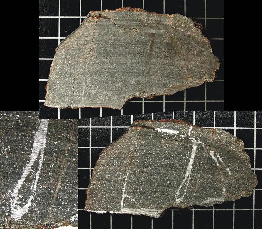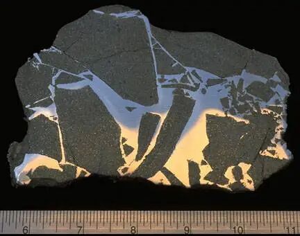 Portales Valley 球粒陨石是一种非常罕见的H6普通球粒陨石,罕见之处主要在于它是一种富含铁的撞击角砾岩陨石。铁在撞击后液化,并填充了被撞击破损产生裂缝的岩石,然后凝固,成为了我们今天所看到的特殊结构陨石,如图,不似其他球粒陨石金属与硅酸盐矿物相互渗入,均匀排列,Portales Valley陨石切面可看到其结构为具大的金属脉穿插在硅酸盐基质中,在Portales Valley陨石的原石表面,可清晰的看到线条突出的金属脉被熔壳覆盖分布在陨石的表面,其中直线条的金属脉,初看容易被误认作熔流线,但它们的突起幅度远超熔壳的厚度,实际为罕见的金属脉。