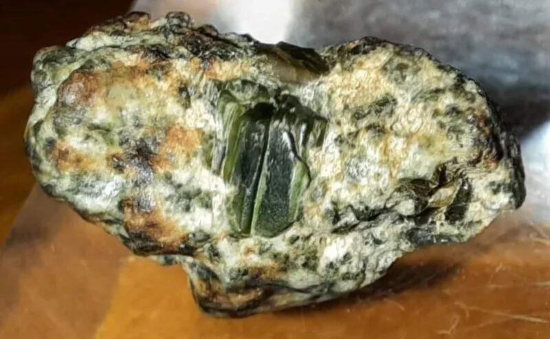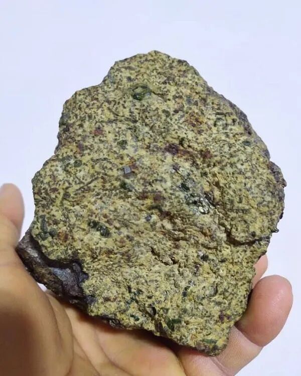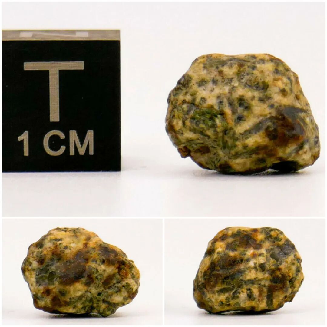 我们今天要介绍的Erg Chech 002陨石,是2020年5月,人们在阿尔及利亚南部的Erg Chech沙漠收集陨石时发现的其中之一个品类陨石,在发现它们时,发现者并没当作陨石收集,因为Erg Chech 002陨石看起来像内含独特绿色宝石的石头,如本文图片,缺乏陨石熔壳,外表整体呈棕褐色和米色,内部镶嵌了较大的绿色、黄绿色或黄棕色晶体,其中晶体尺寸范围可达1.7至11.5mm,肉眼可明显看出。