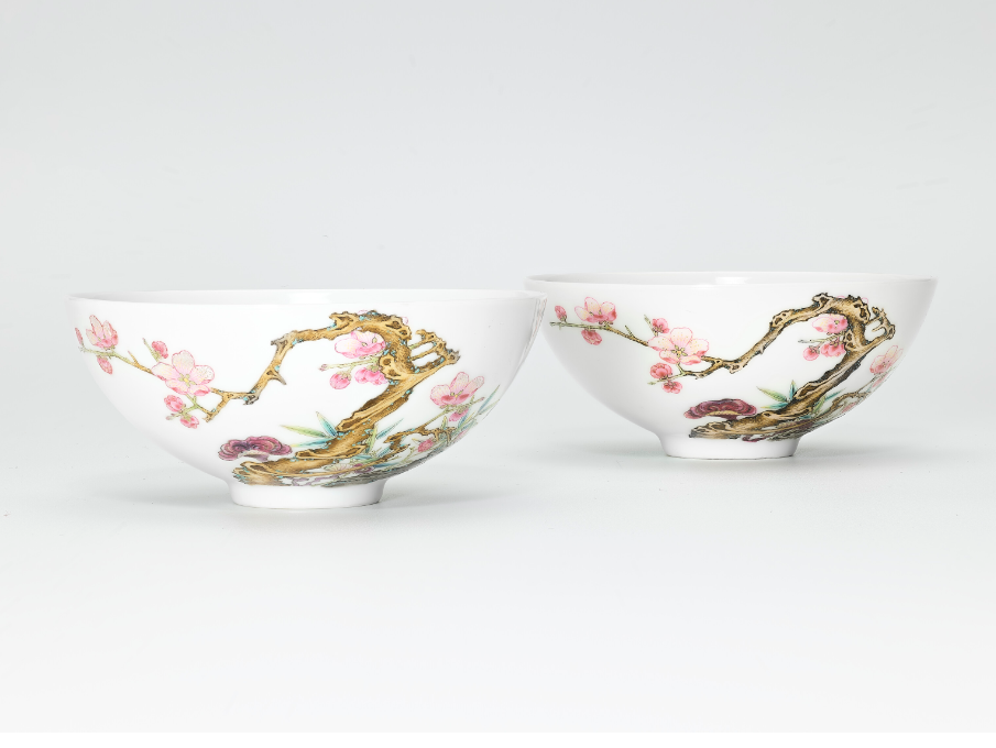 我们今天要介绍的一对雍正精品官窑——粉彩梅竹灵芝纹茶碗,却是罕见的梅花与竹搭配、摒弃松柏,转而组合灵芝的纹饰布局,属于清代雍正官窑瓷器中的稀缺品类。
