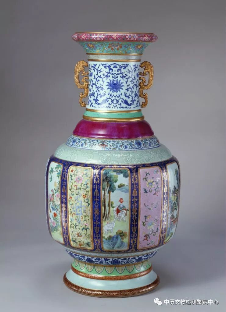 在古代烧窑有句俗语“十窑九不成”这还只针对单种彩、釉。各种釉彩大瓶从烧造工艺上看,青花与仿官釉、仿汝釉、仿哥釉、窑变釉、粉青釉、霁蓝釉等均属高温釉、彩,需先焙烧。而粉彩、珐琅彩、金彩及松石绿釉等均属低温釉彩,需后焙烧。各种釉焙烧的温度不一,有部份温度要求非常苛刻,在没有温度计的过去一切都靠经验来掌握能够烧成,不但体现了当时国力的昌盛,更体现了其工艺技术之高可谓鬼斧神工。这也是此类物品传世仅此一件的原因,就拿当今的科技工艺水平,能够焙烧出此类彩、釉物品也当属不易。